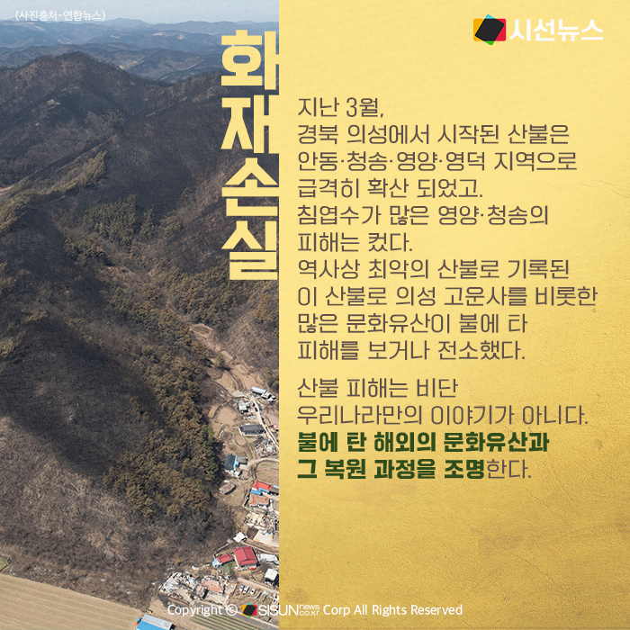 시선뉴스=양원민 기자 / 디자인=김선희 proㅣ지난 3월, 경북 의성에서 시작된 산불은 안동·청송·영양·영덕 지역으로 급격히 확산 되었고. 침엽수가 많은 영양·청송의 피해는 컸다. 역사상 최악의 산불로 기록된 이 산불로 의성 고운사를 비롯한 많은 문화유산이 불에 타 피해를 보거나 전소했다. 산불 피해는 비단 우리나라만의 이야기가 아니다. 불에 탄 해외의 문화유산과 그 복원 과정을 조명한다.