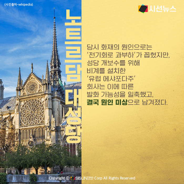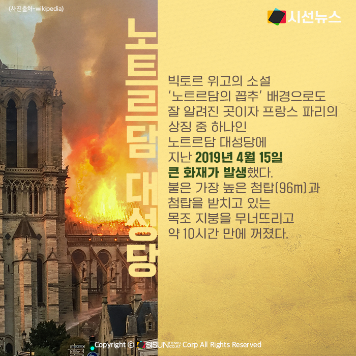 빅토르 위고의 소설 ‘노트르담의 꼽추’ 배경으로도 잘 알려진 곳이자, 프랑스 파리의 상징 중 하나인 노트르담 대성당에는 지난 2019년 4월 15일 큰 화재가 발생했다. 불은 가장 높은 첨탑(96m)과 첨탑을 받치고 있는 목조 지붕을 무너뜨리고 약 10시간 만에 꺼졌다.