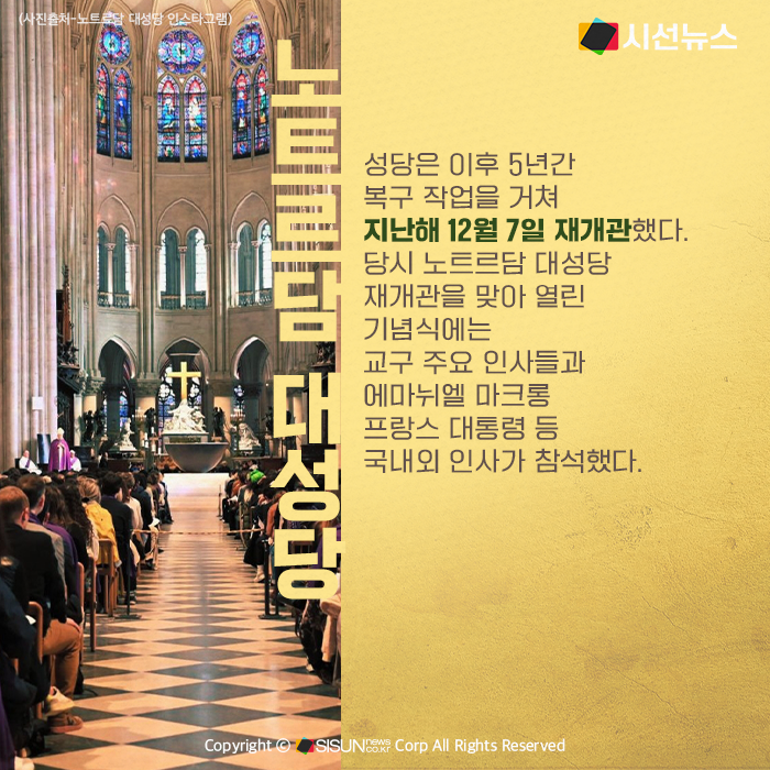 성당은 이후 5년간 복구 작업을 거쳐 지난해 12월 7일 재개관했다. 당시 노트르담 대성당 재개관을 맞아 열린 기념식에는 교구 주요 인사들과 에마뉘엘 마크롱 프랑스 대통령 등 국내외 인사가 참석했다.