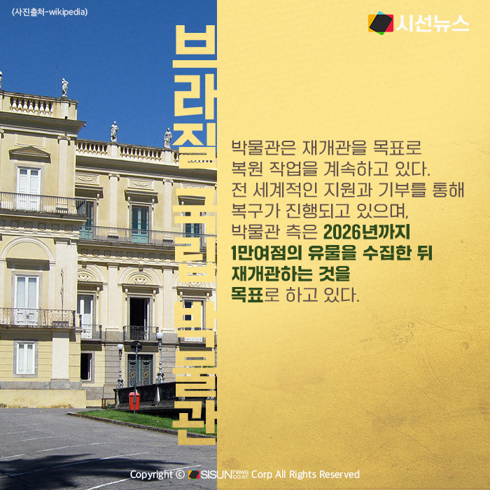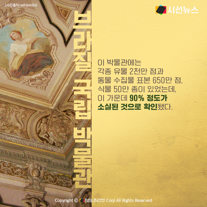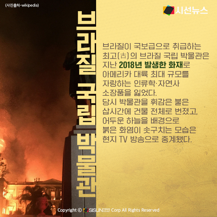 브라질이 국보급으로 취급하는 최고(古)의 브라질 국립 박물관은 지난 2018년 발생한 화재로 아메리카 대륙 최대 규모를 자랑하는 인류학·자연사 소장품을 잃었다. 당시 박물관을 휘감은 불은 삽시간에 건물 전체로 번졌고, 어두운 하늘을 배경으로 붉은 화염이 솟구치는 모습은 현지 TV 방송으로 중계됐다.
