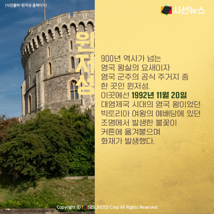 900년 역사가 넘는 영국 왕실의 요새이자 영국 군주의 공식 주거지 중 한 곳인 윈저성. 이곳에선 1992년 11월 20일 대영제국 시대의 영국 왕이었던 빅토리아 여왕의 예배당에 있던 조명에서 발생한 불꽃이 커튼에 옮겨붙으며 화재가 발생했다.