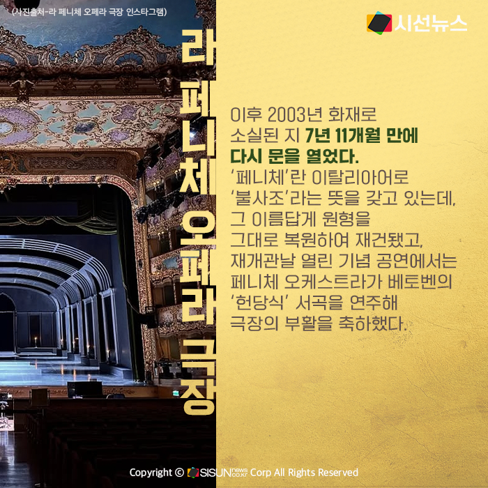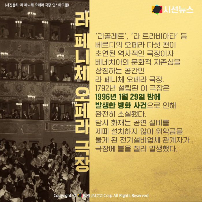 ‘리골레토’, ‘라 트라비아타’ 등 베르디의 오페라 다섯 편이 초연된 역사적인 극장이자 베네치아의 문화적 자존심을 상징하는 공간인 라 페니체 오페라 극장. 1792년 설립된 이 극장은 1996년 1월 29일 밤에 발생한 방화 사건으로 인해 완전히 소실됐다. 당시 화재는 공연 설비를 제때 설치하지 않아 위약금을 물게 된 전기설비업체 관계자가 극장에 불을 질러 발생했다.
