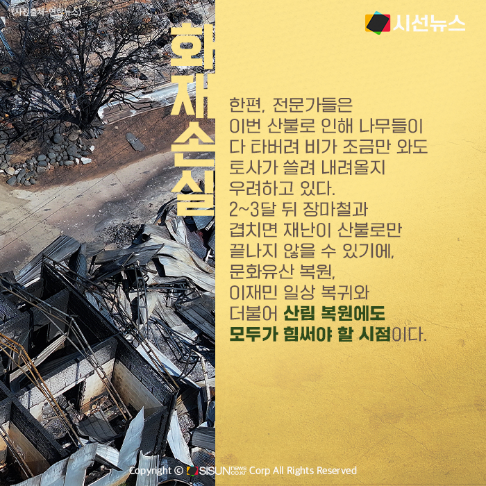한편, 전문가들은 이번 산불로 인해 나무들이 다 타버려 비가 조금만 와도 토사가 쓸려 내려올지 우려하고 있다. 2~3달 뒤 장마철과 겹치면 재난이 산불로만 끝나지 않을 수 있기에, 문화유산 복원, 이재민 일상 복귀와 더불어 산림 복원에도 모두가 힘써야 할 시점이다.