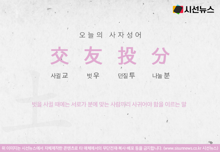 [사귈 교, 벗 우, 던질 투, 나눌 분]의 글자로 만들어진 사자성어 교우투분은 벗을 사귈 때에는 서로가 분에 맞는 사람끼리 사귀어야 함을 이르는 말입니다.