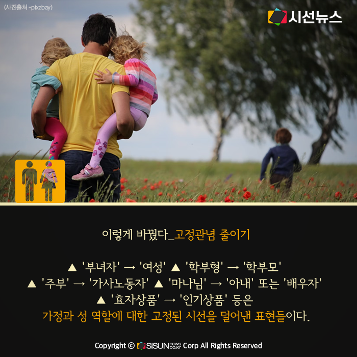 사전에 수록된 주요 사례들을 살펴보면, 먼저 가정과 성 역할에 대한 고정된 시선을 덜어낸 표현들이 눈에 띈다. ‘부녀자’는 ‘여성’으로, ‘학부형’은 ‘학부모’로, ‘주부’는 ‘가사노동자’로 바뀌었다. ‘마나님’이라는 말도 이제는 ‘아내’ 또는 ‘배우자’로 표현하며, ‘효자상품’이라는 표현은 성별에 관계없이 인기 있는 제품을 가리키는 ‘인기상품’으로 순화됐다.