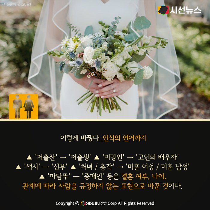 사회적 인식을 담은 언어 역시 개선됐다. 대표적으로 ‘저출산’이라는 표현은 부정적인 이미지를 줄이고자 ‘저출생’으로 바꿨으며, ‘미망인’은 고인을 기준으로 정의하는 표현이라는 점에서 ‘고인의 배우자’로 순화됐다. 결혼과 관련된 표현 중에서도 ‘색시’는 ‘신부’로, ‘처녀/총각’은 각각 ‘미혼 여성’, ‘미혼 남성’으로 표현하는 것이 권장된다. 중매인을 뜻하는 ‘마담뚜’ 역시 성적 이미지나 비속어 느낌을 줄이기 위해 ‘중매인’이라는 표현으로 바꿨다.