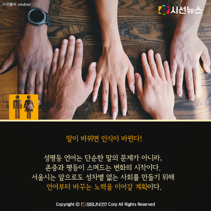 시선뉴스=심재민 기자 | 서울시가 일상 속에 스며든 성차별적 언어를 바로잡기 위해 ‘성평등 언어사전’을 발간했다. 성역할 고정관념을 강화하거나, 특정 성별을 중심으로 구성된 표현을 성평등한 언어로 순화함으로써 모두가 존중받는 사회로 나아가기 위한 시도다.