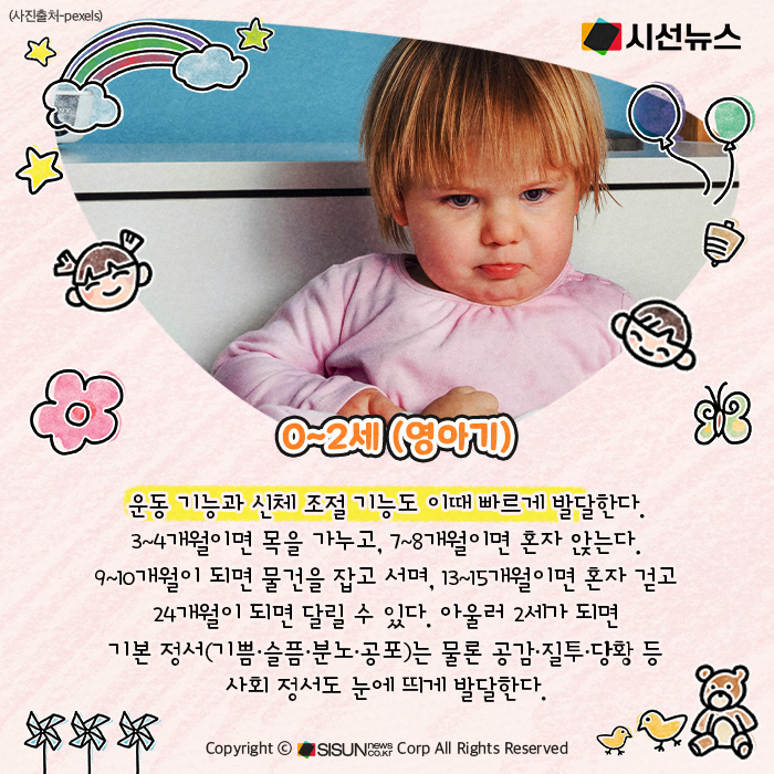 운동 기능과 신체 조절 기능도 이때 빠르게 발달한다. 3~4개월이면 목을 가누고, 7~8개월이면 혼자 앉는다. 9~10개월이 되면 물건을 잡고 서며, 13~15개월이면 혼자 걷고 24개월이 되면 달릴 수 있다. 아울러 2세가 되면 기본 정서(기쁨∙슬픔∙분노∙공포)는 물론 공감∙질투∙당황 등 사회 정서도 눈에 띄게 발달한다.