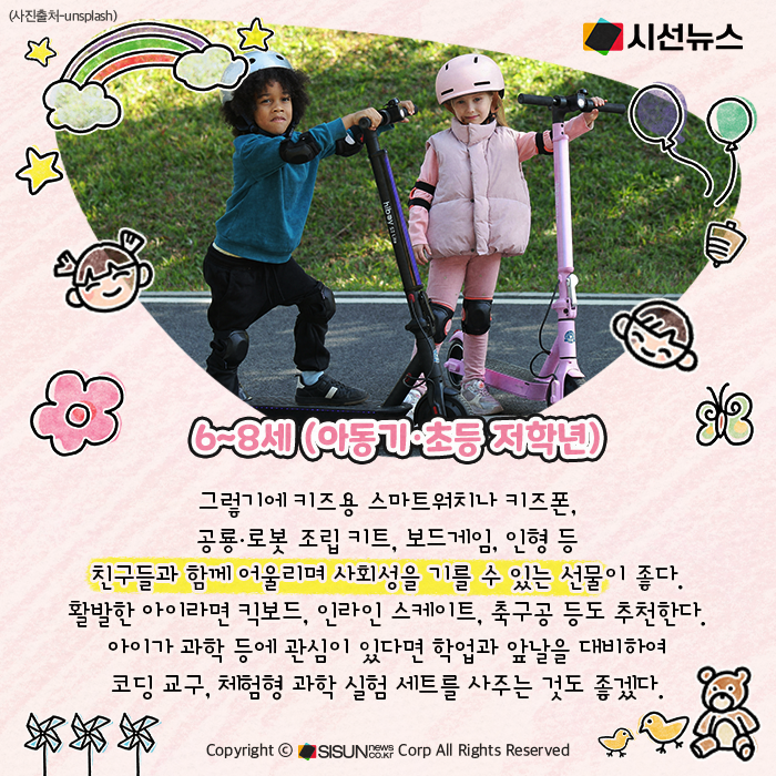 그렇기에 키즈용 스마트워치나 키즈폰, 공룡·로봇 조립 키트, 보드게임, 인형 등 친구들과 함께 어울리며 사회성을 기를 수 있는 선물이 좋다. 활발한 아이라면 킥보드, 인라인 스케이트, 축구공 등도 추천한다. 아이가 과학 등에 관심이 있다면 학업과 앞날을 대비하여 코딩 교구, 체험형 과학 실험 세트를 사주는 것도 좋겠다.