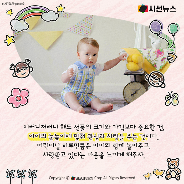 이러니저러니 해도 선물의 크기와 가격보다 중요한 건, 아이의 눈높이에 맞춰 관심과 사랑을 주는 것이다. 어린이날 하루만큼은 아이와 함께 놀아주고, 사랑받고 있다는 마음을 느끼게 해주자.