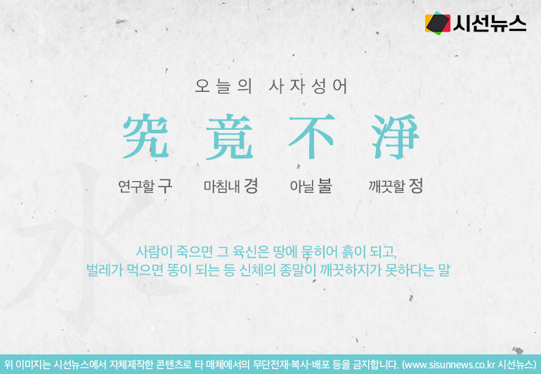 [연구할 구, 마침내 경, 아닐 불, 깨끗할 정]의 글자로 만들어진 사자성어 구경부정은 사람이 죽으면 그 육신은 땅에 묻히어 흙이 되고, 벌레가 먹으면 똥이 되는 등 신체의 종말이 깨끗하지가 못하다는 말입니다.
