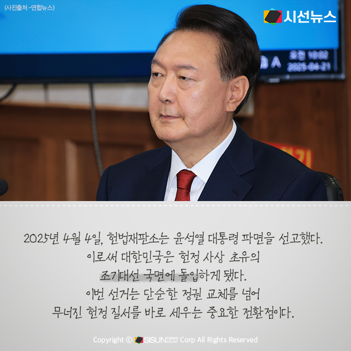 시선뉴스=심재민 기자 | 2025년 4월 4일, 헌법재판소가 윤석열 대통령에 대한 파면을 선고하면서 대한민국은 헌정 사상 초유의 조기대선 국면에 돌입했다. 이번 선거는 단순한 정권 교체를 넘어, 무너진 헌정 질서를 바로 세우는 중요한 전환점으로 평가된다. 결국, 국민 한 사람 한 사람의 선택이 대한민국의 향후 5년을 결정하게 될 것이다.