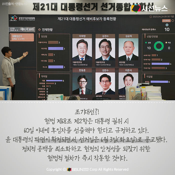 조기대선은 헌법 제68조 제2항에 따라 대통령 궐위 시 60일 이내에 후임자를 선출해야 한다는 규정에 따라 진행된다. 윤 대통령의 파면이 확정되며 중앙선거관리위원회는 선거일을 오는 6월 3일(화요일)로 공고했다. 정치적 공백을 최소화하고 헌정의 안정성을 되찾기 위한 헌법적 절차가 즉시 작동한 셈이다.