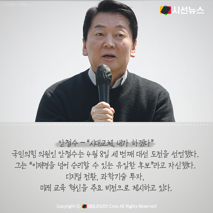 국민의힘 안철수 의원은 4월 8일 세 번째 대선 도전을 선언했다. 그는 “이재명을 넘어 승리할 수 있는 유일한 후보”라고 자신하며, 디지털 전환과 과학기술 투자, 미래 교육 혁신을 주력 비전으로 강조했다.