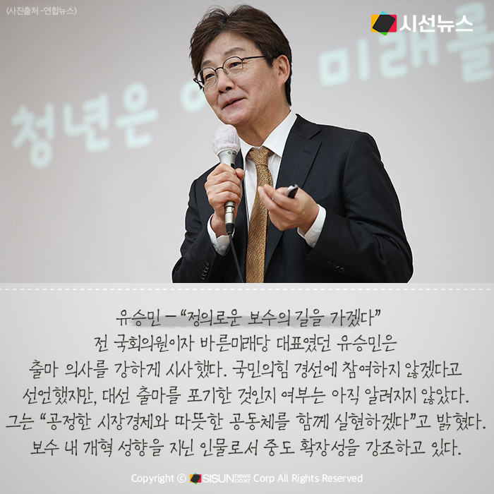 전 국회의원이자 바른미래당 대표였던 유승민은 출마 의사를 강하게 시사했다. 국민의힘 경선에 참여하지 않겠다고 선언했지만, 대선 출마를 포기한 것인지 여부는 아직 알려지지 않았다. 그는 “공정한 시장경제와 따뜻한 공동체를 함께 실현하겠다”고 밝혔다. 보수 내 개혁 성향을 지닌 인물로서 중도 확장성을 강조하고 있다.