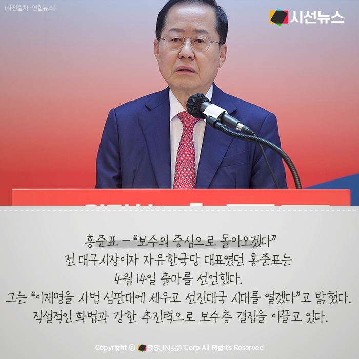 마지막으로, 홍준표 전 대구시장은 4월 14일 출마를 선언하며 “이재명을 사법 심판대에 세우고 선진대국 시대를 열겠다”고 밝혔다. 그는 직설적인 화법과 추진력을 앞세워 보수층의 결집을 유도하고 있다.