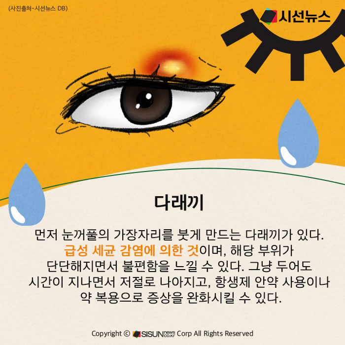 먼저 눈꺼풀의 가장자리를 붓게 만드는 다래끼가 있다. 급성 세균 감염에 의한 것이며, 해당 부위가 단단해지면서 불편함을 느낄 수 있다. 그냥 두어도 시간이 지나면서 저절로 나아지고, 항생제 안약 사용이나 약 복용으로 증상을 완화시킬 수 있다. 다만 감염이 확산하는 경우에는 적절한 치료로 재발을 방지해야 한다.
