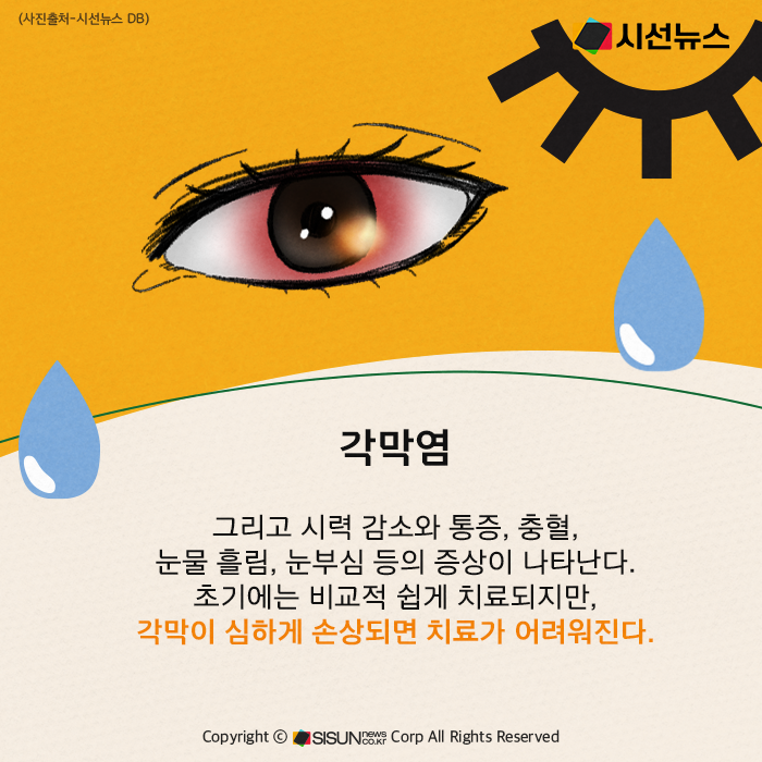 검은자 부위를 덮고 있는 각막에 염증이 생기면 각막염이다. 결막염과 마찬가지로 병원균 감염에 의한 감염성 노출성 각막염, 독성 각막염, 신경영양각막염 등 비감염성 각막염으로 나뉜다. 그리고 시력 감소와 통증, 충혈, 눈물 흘림, 눈부심 등의 증상이 나타난다. 초기에는 비교적 쉽게 치료되지만, 각막이 심하게 손상되면 치료가 어려워진다.