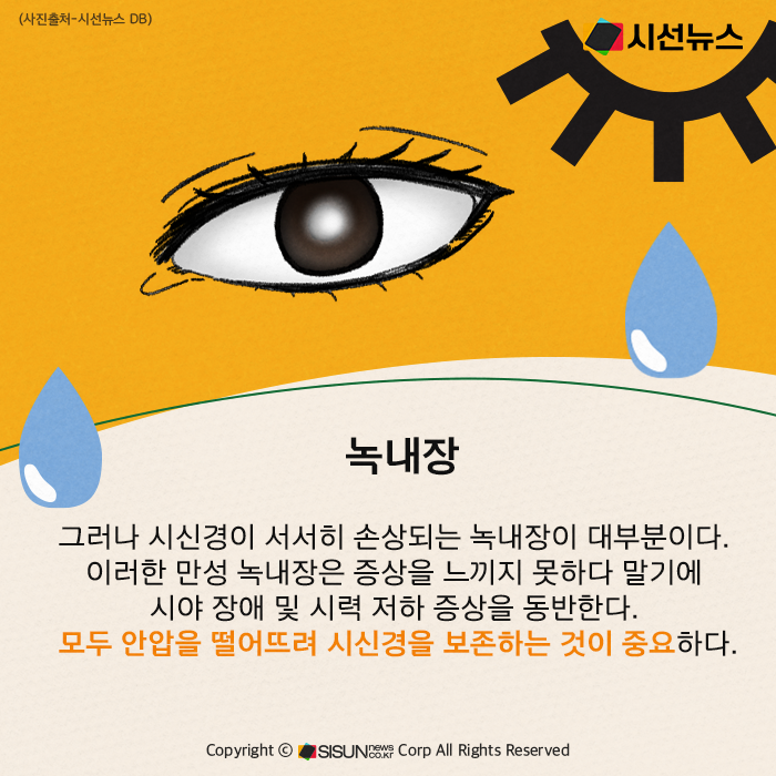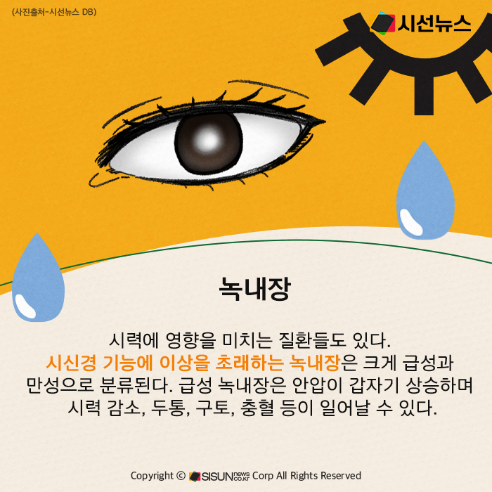 시력에 영향을 미치는 질환들도 있다. 시신경 기능에 이상을 초래하는 녹내장은 크게 급성과 만성으로 분류된다. 급성 녹내장은 안압이 갑자기 상승하며 시력 감소, 두통, 구토, 충혈 등이 일어날 수 있는데, 시신경이 서서히 손상되는 녹내장이 대부분이다. 이러한 만성 녹내장은 증상을 느끼지 못하다 말기에 시야 장애 및 시력 저하 증상을 동반한다. 모두 안압을 떨어뜨려 시신경을 보존하는 것이 중요하다.