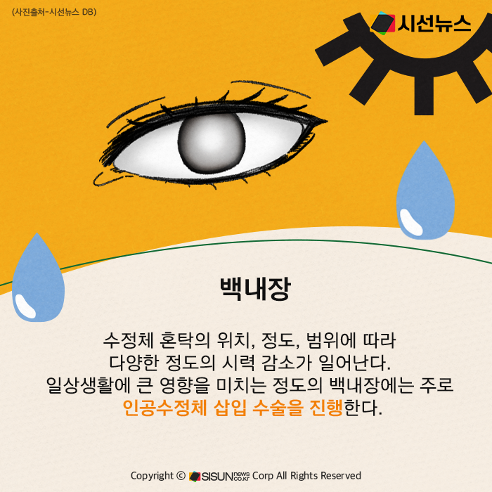 수정체의 혼탁으로 사물이 뿌옇게 보이게 되는 질환은 백내장이라고 한다. 선천성 백내장은 대부분 원인 불명이고, 후천성 백내장은 나이가 들면서 생기거나 외상에 의해서도 나타난다. 수정체 혼탁의 위치, 정도, 범위에 따라 다양한 정도의 시력 감소가 일어난다. 일상생활에 큰 영향을 미치는 정도의 백내장에는 주로 인공수정체 삽입 수술을 진행한다.