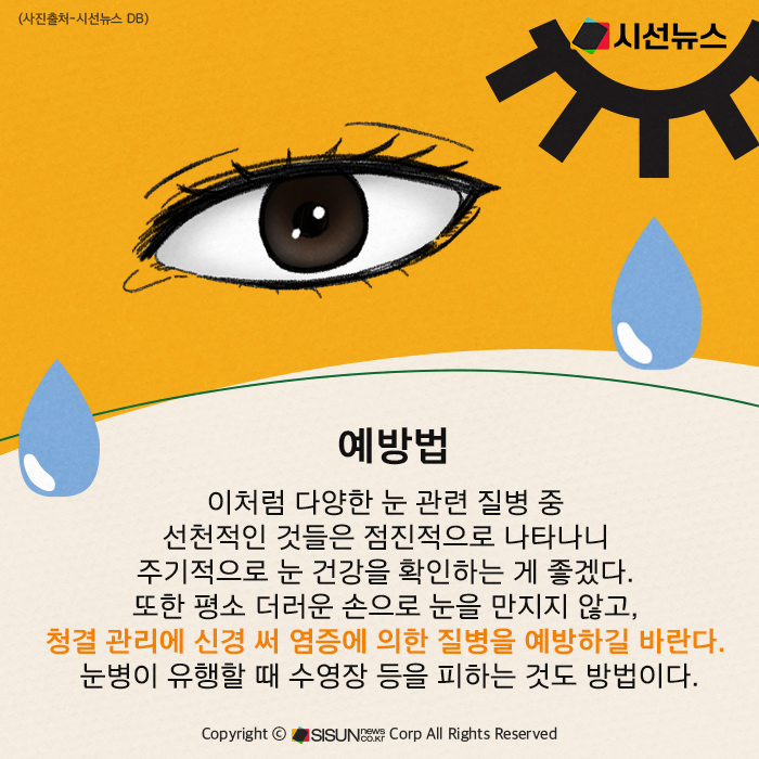 이처럼 다양한 눈 관련 질병 중 선천적인 것들은 점진적으로 나타나니 주기적으로 눈 건강을 확인하는 게 좋겠다. 또한 평소 더러운 손으로 눈을 만지지 않고, 청결 관리에 신경 써 염증에 의한 질병을 예방하길 바란다. 눈병이 유행할 때 수영장 등을 피하는 것도 방법이다.