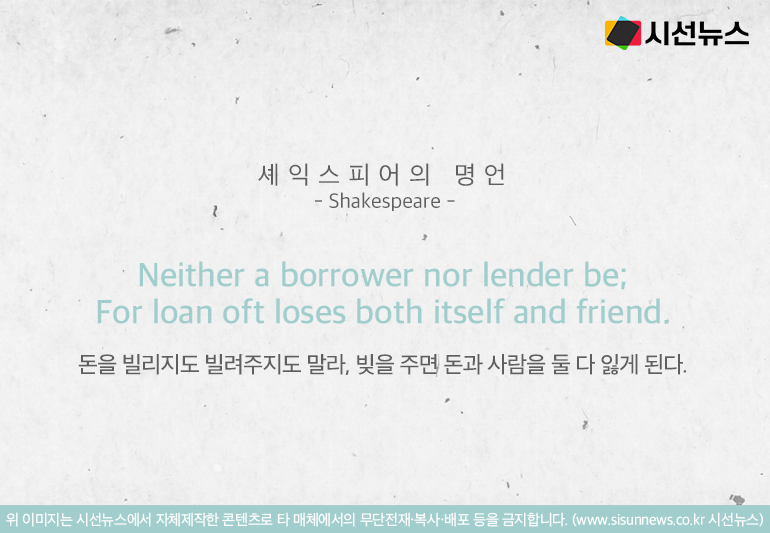 ‘돈을 빌리지도 빌려주지도 말라, 빚을 주면 돈과 사람을 둘 다 잃게 된다.’ <세익스피어>