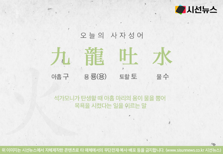 [아홉 구, 용 룡(용), 토할 토, 물 수]의 글자로 만들어진 사자성어 구룡토수는 석가모니가 탄생할 때 아홉 마리의 용이 물을 뿜어 목욕을 시켰다는 일을 이르는 말입니다.