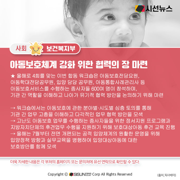 → 특히 올해는 7월부터 전면 개편되는 공적 입양체계의 원활한 운영을 위해 입양정책 방향과 실무교육을 병행하여 입양대상아동에 대한 보호방안을 함께 모색