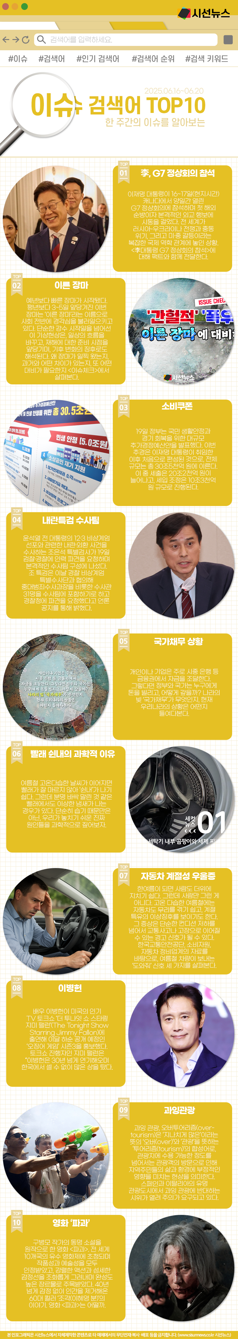 시선뉴스=박진아 기자 / 디자인=김선희 proㅣ지난주 한주간의 이슈 Top10입니다. 지난주에는 어떤 키워드들이 이슈가 되었을까요?