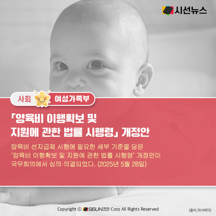 양육비 선지급제 시행에 필요한 세부 기준을 담은 ‘양육비 이행확보 및 지원에 관한 법률 시행령’ 개정안이 국무회의에서 심의·의결되었다. (2025년 5월 28일)