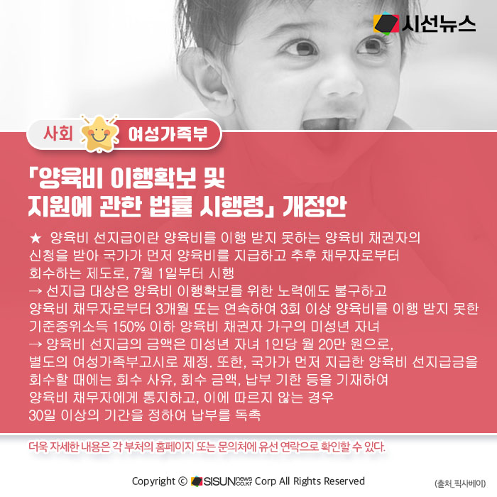 ★ 양육비 선지급이란 양육비를 이행 받지 못하는 양육비 채권자의 신청을 받아 국가가 먼저 양육비를 지급하고 추후 채무자로부터 회수하는 제도로, 7월 1일부터 시행