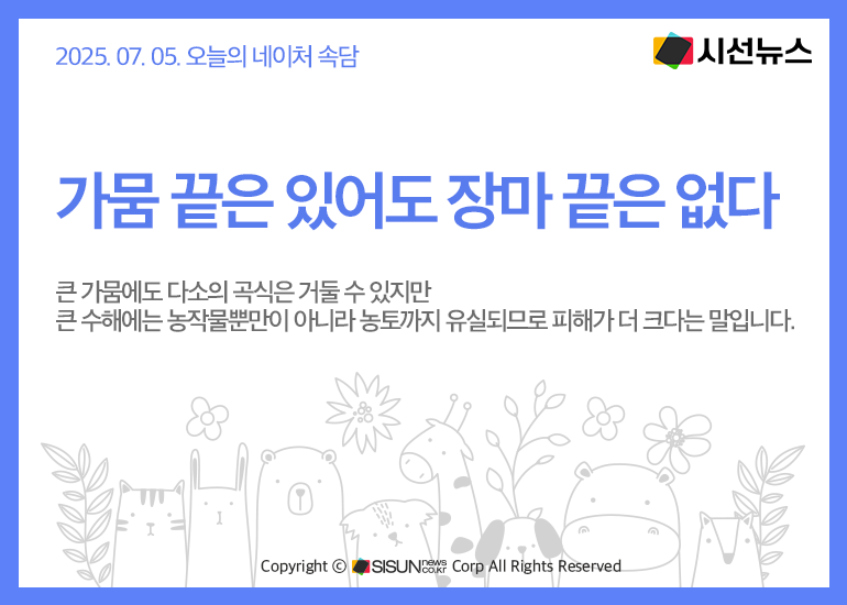 오늘의 네이처 속담은 <가뭄 끝은 있어도 장마 끝은 없다>입니다.