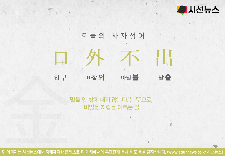 [입 구, 바깥 외, 아닐 불, 날 출]의 글자로 만들어진 사자성어 구외불출은 ‘말을 입 밖에 내지 않는다.’는 뜻으로, 비밀을 지킴을 이르는 말입니다.