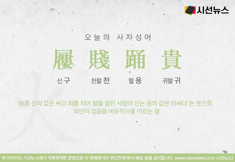 [신 구, 천할 천, 뛸 용, 귀할 귀]의 글자로 만들어진 사자성어 구천용귀는 ‘보통 신의 값은 싸고 죄를 지어 발을 잘린 사람이 신는 용의 값은 비싸다.’는 뜻으로, 죄인이 많음을 비유적으로 이르는 말입니다.