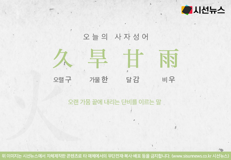 [오랠 구, 가물 한, 달 감, 비 우]의 글자로 만들어진 사자성어 구한감우는 오랜 가뭄 끝에 내리는 단비를 이르는 말입니다.