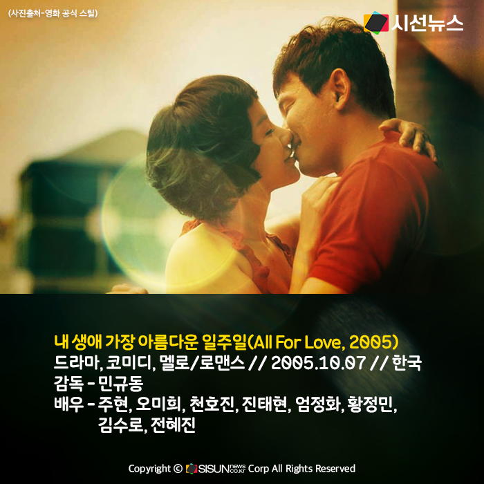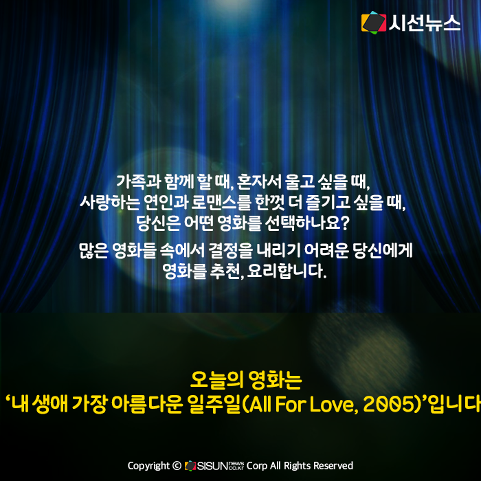 가족과 함께 할 때, 혼자서 울고 싶을 때, 사랑하는 연인과 로맨스를 한껏 더 즐기고 싶을 때, 당신은 어떤 영화를 선택하나요? 많은 영화들 속에서 결정을 내리기 어려운 당신에게 영화를 추천, 요리합니다. 오늘의 영화는 ‘내 생애 가장 아름다운 일주일(All For Love, 2005)’입니다.