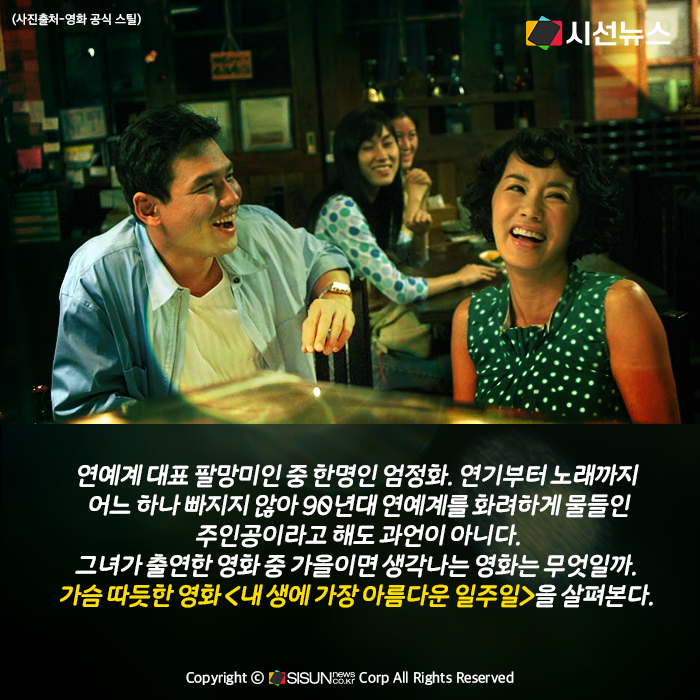 엄정화는 팔방미인으로 유명하다. 노래면 노래, 연기면 연기! 모든 분야에서 장점을 발휘하는 스타 중 한명이다. 그리고 그녀의 수많은 영화 중 가슴을 따뜻하게 해주는 한 편을 살펴보았다. 영화 <내 생에 가장 아름다운 일주일>이다.