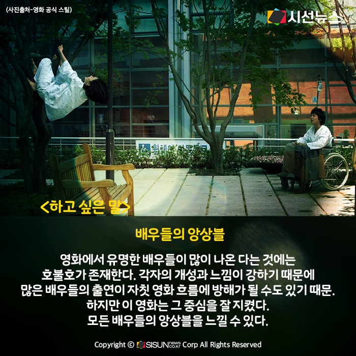 영화에서 유명한 배우들이 많이 나온 다는 것에는 호불호가 존재한다. 각자의 개성과 느낌이 강하기 때문에 많은 배우들의 출연이 자칫 영화의 흐름에 방해가 될 수도 있기 때문이다. 하지만 이 영화는 그 중심을 잘 지켰다. 모든 배우들의 앙상블을 느낄 수 있다.