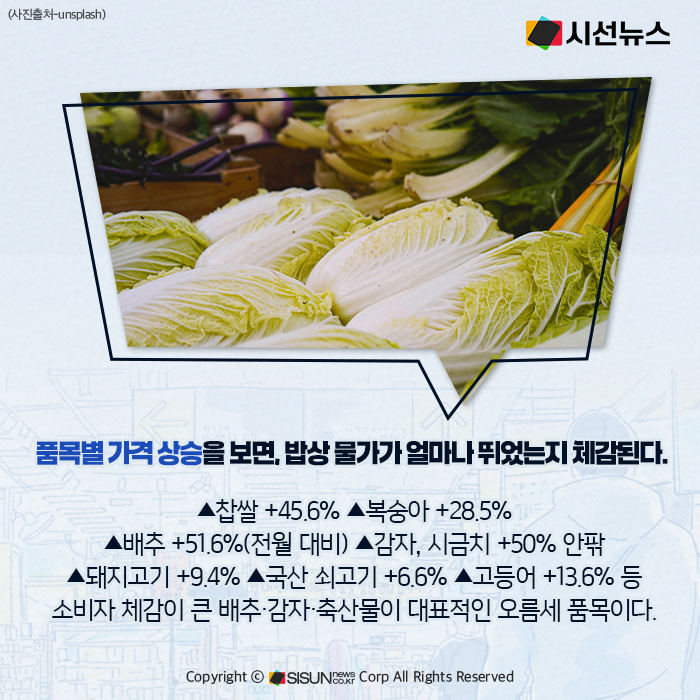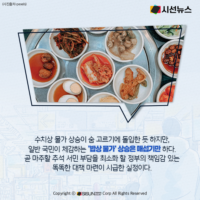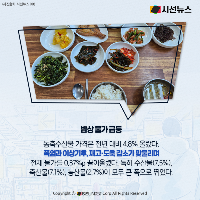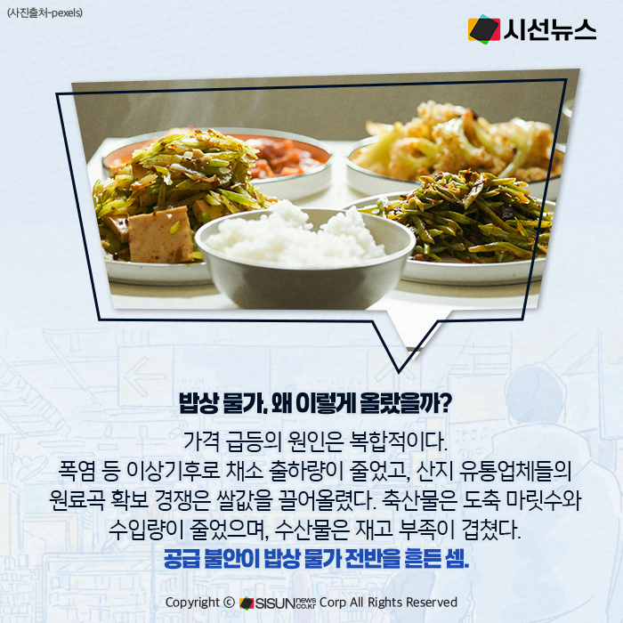 가격 급등의 원인은 복합적이다. 폭염 등 이상기후로 채소 출하량이 줄었고, 산지 유통업체들의 원료곡 확보 경쟁은 쌀값을 끌어올렸다. 축산물은 도축 마릿수와 수입량이 줄었으며, 수산물은 재고 부족이 겹쳤다. 공급 불안이 밥상 물가 전반을 흔든 셈이다.