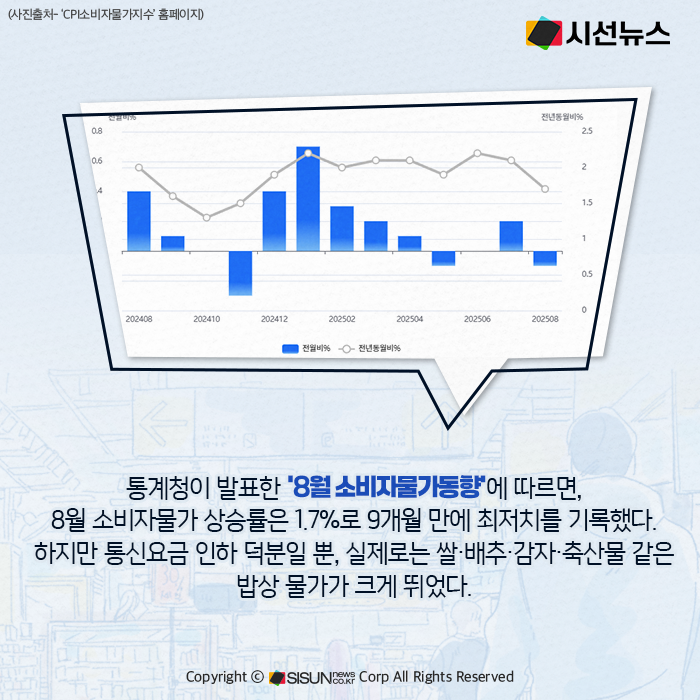 8월 소비자물가 상승률은 1.7%로 9개월 만에 최저치를 기록했다. 통계만 보면 물가가 안정세로 접어든 듯 보이지만, 실제 서민이 체감하는 밥상 물가는 사뭇 다르다. 쌀·배추·감자·축산물 같은 주요 먹거리 가격이 줄줄이 오르면서 추석을 앞둔 서민 가계 부담이 커지고 있다.