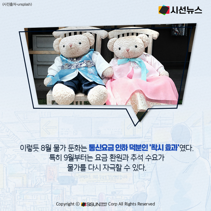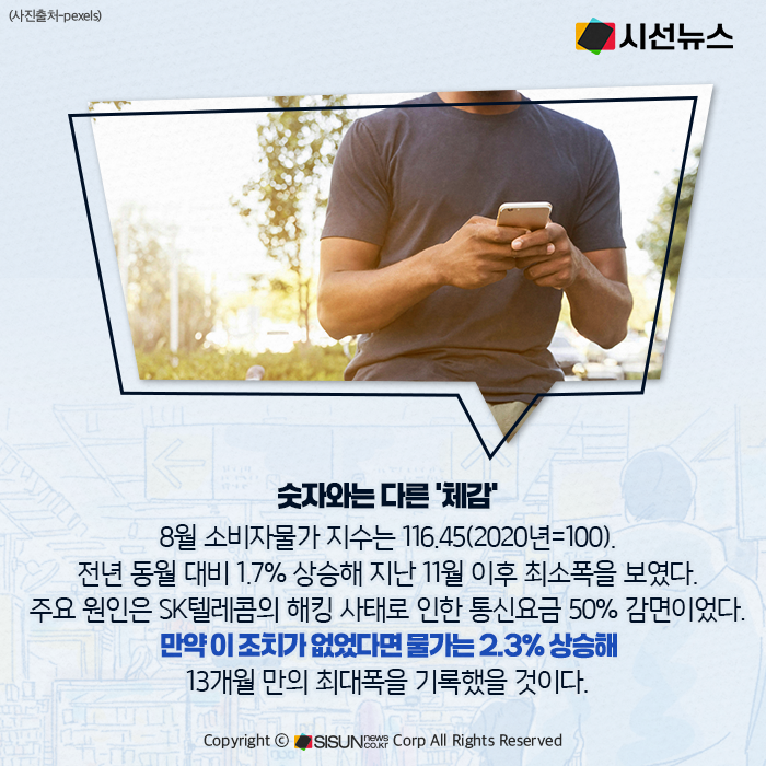 통계청이 발표한 ‘8월 소비자물가동향’에 따르면, 지난달 소비자물가지수는 116.45(2020년=100)로 전년 동월 대비 1.7% 상승했다. 지난해 11월 이후 가장 낮은 상승률이다. SK텔레콤이 해킹 사태로 가입자 전체 요금을 한 달간 50% 감면하면서 통신요금이 21%나 하락했고, 이 효과가 물가 둔화의 가장 큰 원인으로 작용했다. 만약 통신요금 인하가 없었다면 물가 상승률은 2.3%에 달해 13개월 만의 최대폭을 기록했을 것이라는 분석도 나온다.