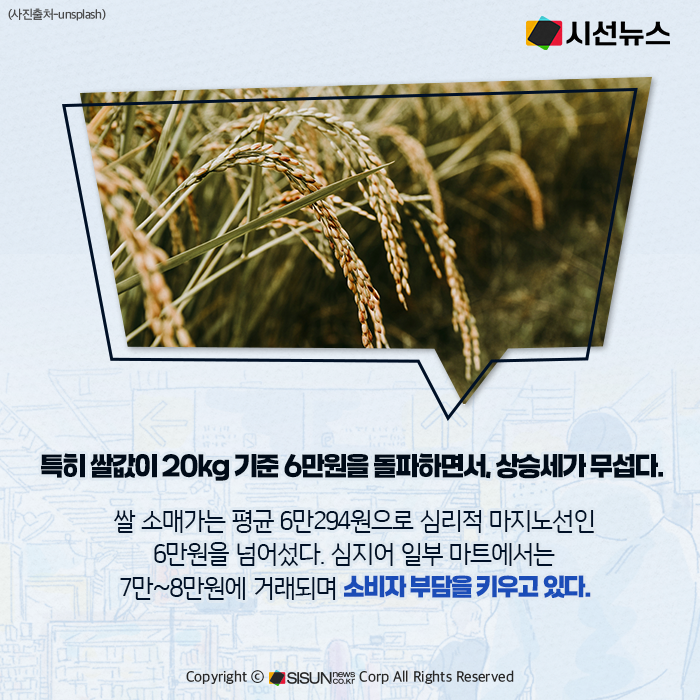 특히 쌀값은 심리적 마지노선으로 불리는 20kg당 6만원을 돌파했다. 9월 2일 기준 쌀 20kg 소매가는 평균 6만294원으로, 지난해보다 17.2%, 평년보다 14% 비쌌다. 일부 마트에서는 7만~8만원대에 거래되기도 했다. 햅쌀 출하를 앞둔 시점에서 재고 부족에 따른 원료곡 확보 경쟁이 가격 상승을 부추긴 것으로 풀이된다.