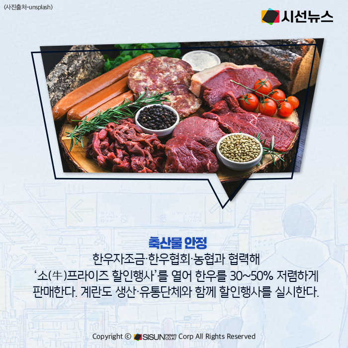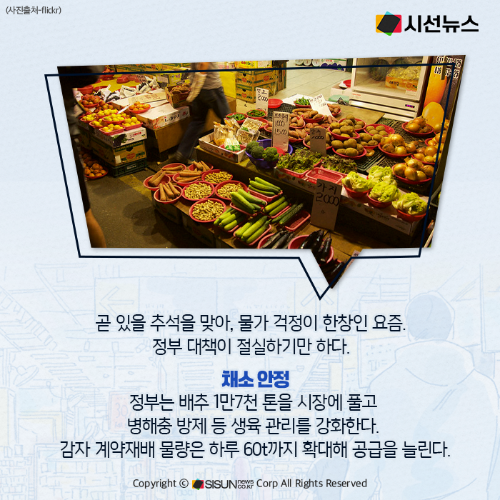 정부는 추석을 앞두고 밥상 물가 안정을 위해 비축 물량 공급과 할인 행사 등 모든 수단을 동원하고 있다. 배추는 1만7천 톤을 시장에 풀고 병해충 방제를 강화한다. 감자는 계약재배 물량을 하루 60t까지 확대한다. 축산물의 경우 한우자조금·한우협회·농협과 협력해 최대 50%까지 저렴하게 판매하는 ‘소(牛)프라이즈 할인행사’를 진행하며, 계란도 생산·유통단체와 협력해 할인 판매한다. 수산물은 고등어 등에 할당관세를 적용하고 비축 물량을 방출해 가격 안정에 나선다.