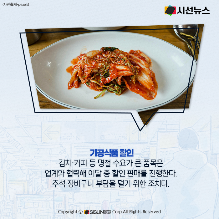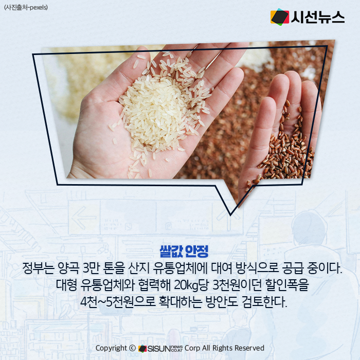 쌀값 안정도 핵심 과제다. 농식품부는 정부 양곡 3만t을 산지 유통업체에 대여해 원료곡 부족을 완화하고 있다. 동시에 대형 유통업체와 협력해 쌀값 할인 폭을 현재 20kg당 3천원에서 4천~5천원으로 확대하는 방안도 검토한다. 가공식품의 경우 명절 수요가 큰 김치·커피 등을 대상으로 할인 행사를 추진할 계획이다.