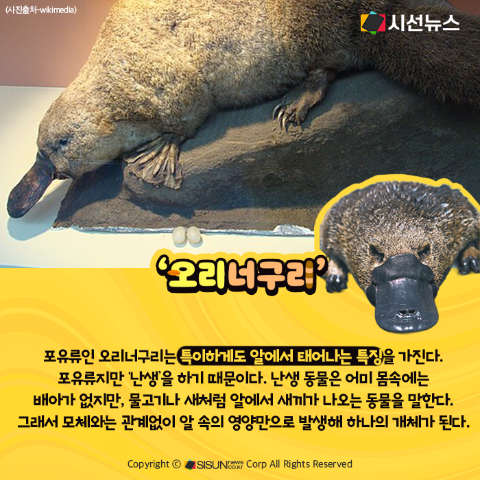 포유류인 오리너구리는 특이하게도 알에서 태어나는 특징을 가진다. 포유류지만 ‘난생’을 하기 때문이다. 난생 동물은 어미 몸속에는 배아가 없지만, 물고기나 새처럼 알에서 새끼가 나오는 동물을 말한다. 그래서 모체와는 관계없이 알 속의 영양만으로 발생해 하나의 개체가 된다.