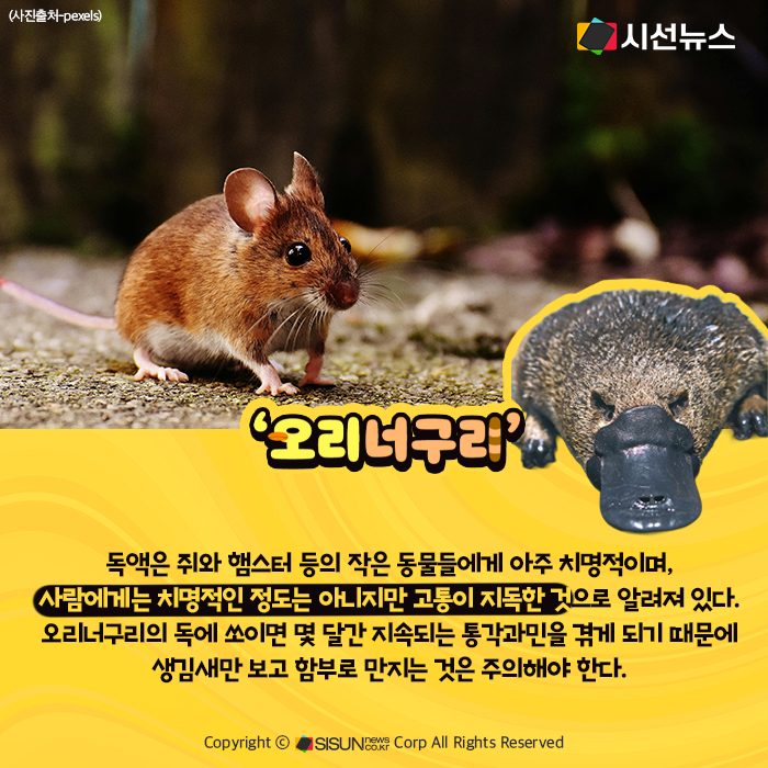 독액은 쥐와 햄스터 등의 작은 동물들에게 아주 치명적이며, 사람에게는 치명적인 정도는 아니지만 고통이 지독한 것으로 알려져 있다. 오리너구리의 독에 쏘이면 몇 달간 지속되는 통각과민을 겪게 되기 때문에 생김새만 보고 함부로 만지는 것은 주의해야 한다.