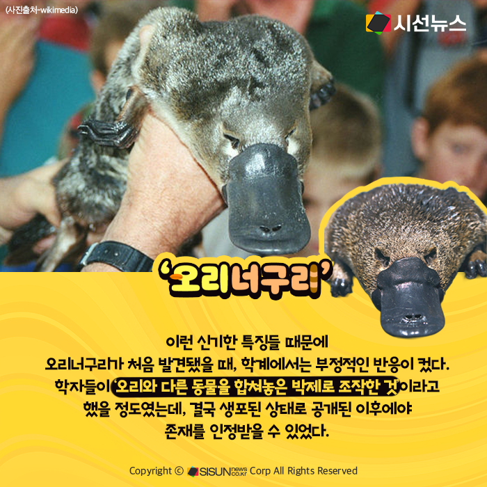 이런 신기한 특징들 때문에 오리너구리가 처음 발견됐을 때, 학계에서는 부정적인 반응이 컸다. 학자들이 ‘오리와 다른 동물을 합쳐놓은 박제로 조작한 것’이라고 했을 정도였는데, 결국 생포된 상태로 공개된 이후에야 존재를 인정받을 수 있었다.