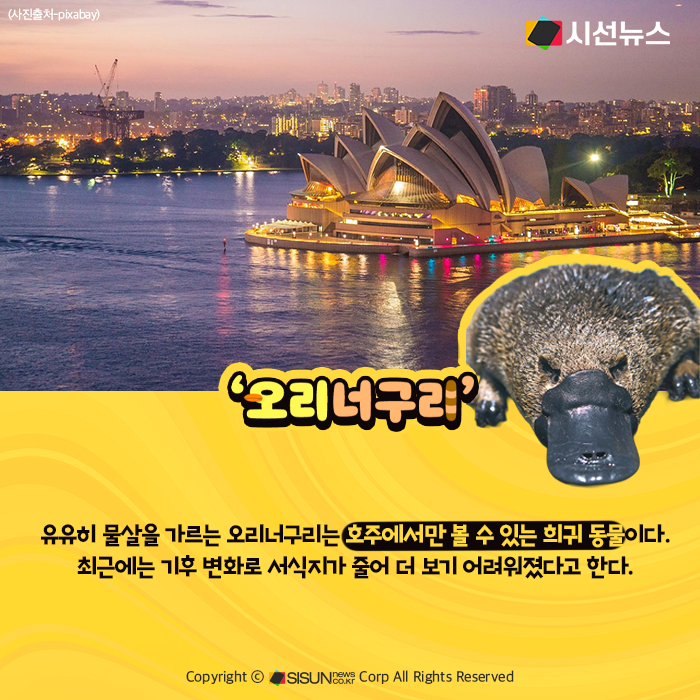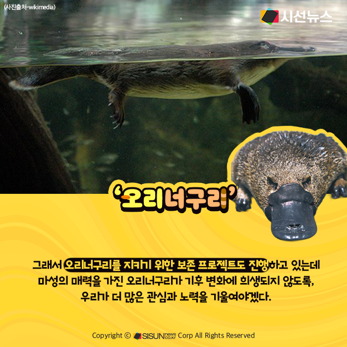 유유히 물살을 가르는 오리너구리는 호주에서만 볼 수 있는 희귀 동물이다. 최근에는 기후 변화로 서식지가 줄어 더 보기 어려워졌다고 한다. 그래서 오리너구리를 지키기 위한 보존 프로젝트도 진행하고 있는데 마성의 매력을 가진 오리너구리가 기후 변화에 희생되지 않도록, 우리가 더 많은 관심과 노력을 기울여야겠다.