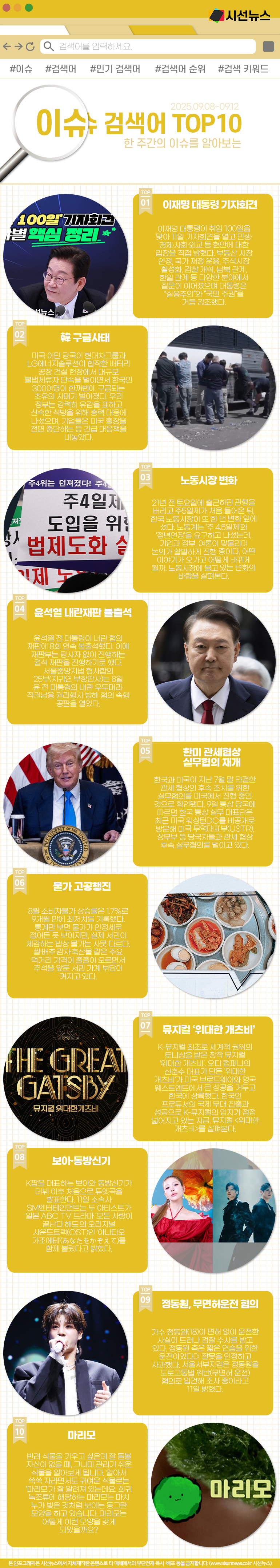 지난주 한주간의 이슈 Top10입니다. 지난주에는 어떤 키워드들이 이슈가 되었을까요?