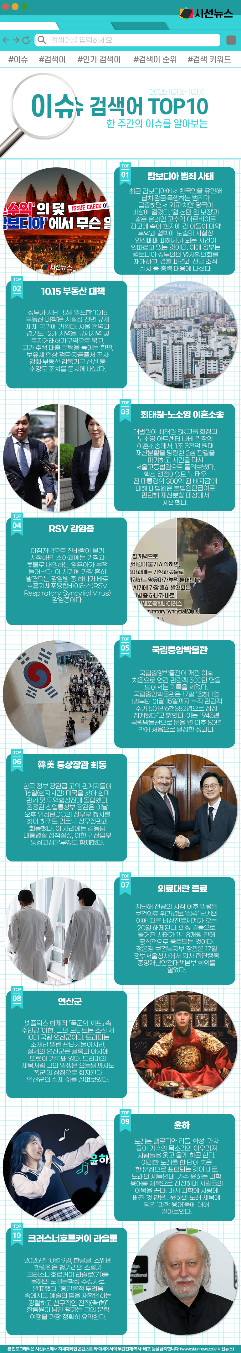지난주 한주간의 이슈 Top10입니다. 지난주에는 어떤 키워드들이 이슈가 되었을까요?